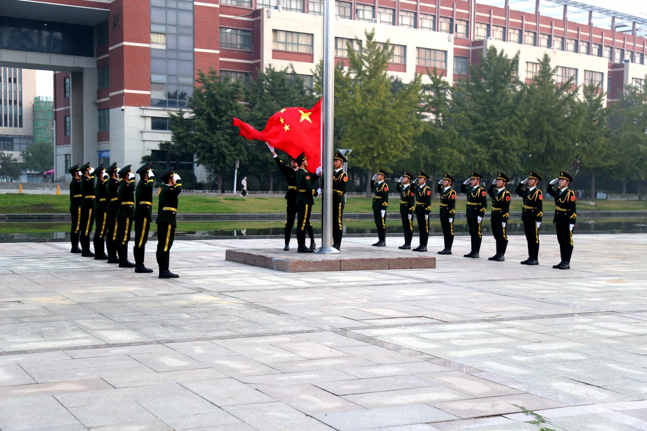 6:30,升旗仪式正式开始,国旗护卫队迈着铿锵有力的步伐将国旗护送至升旗台,伴随着庄严的《义勇军进行曲》,五星红旗缓缓升起,飘扬在泰山广场上,沐浴在曙光中,师生行注目礼,姿态笔直挺立,自豪激动之情溢于言表。