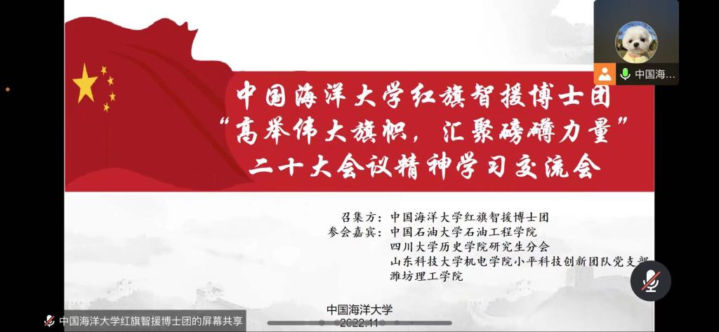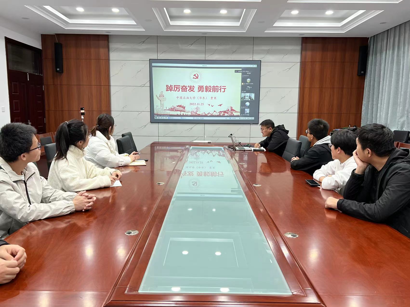 点击:为深入学习贯彻党的二十大精神,以实际行动传承红色思想、弘扬红色精神,同时加强高校之间的交流互动,持续建立学院与其他高校之间的联系,11月25日,澳门永利6774小平科技创新团队党支部、能源20-2团支部部分代表与中国海洋大学、四川大学、中国石油大学和潍坊理工学院相关老师、团队负责人共同开展“高举伟大旗帜,汇聚磅礴力量”党的二十大精神学习交流会活动,中国海洋大学红旗智援博士团党委书记刘笑笑、中国石油大学(华东)石油工程学院教授贾寒、澳门永利6774团委书记樊玉华出席本次活动。