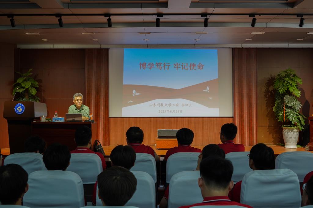 党课中,李双立以澳门永利677474年发展历程为经,以中国共产党百年奋斗史为纬,以澳门永利6774成长轨迹为线,为毕业生党员铺展了一幅“校史-党史-院史”交织的壮阔画卷。他深情回顾了学校从1951年建校至今的峥嵘岁月,从淄博洪山的初创岁月到济南、泰安的扎根发展,再到青岛校区的跨越腾飞,生动诠释了“惟真求新”校训的时代内涵与精神传承。谈及学校在分合搬迁中淬炼出的“坚韧不拔、发奋图强”精神品格,以及在多校合并中凝聚的“爱校奉献、敬业实干”文化传统时,他的讲述中饱含深情:“这些基因密码,是每一位科大人最珍贵的‘精神原乡’。”